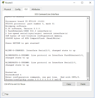 kita konfiguarsi Default Routing nya pada setiap router, caranya : “ double
