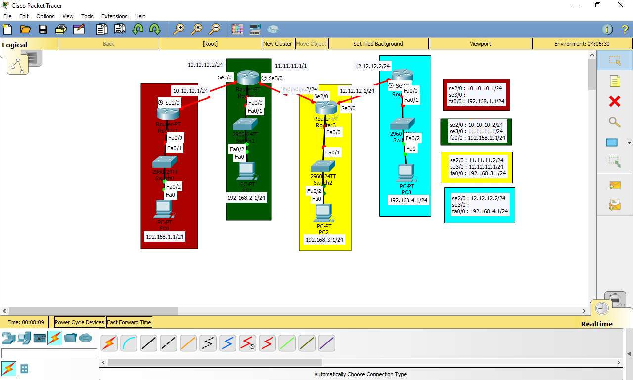 menggunakan aplikasi cisco packet tracer dengan 4 router sekaligus agar