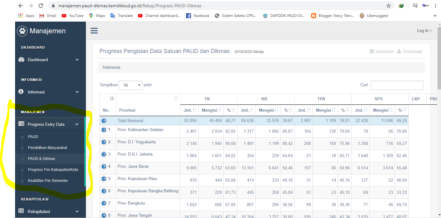 - Untuk Melihat Data yang sudah Sinkron atau belum, Bunda masuk ke Web manajemen.paud-dikmas.kemdikbud