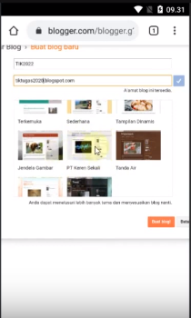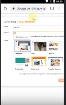 3. Tema : untuk Tema kalian tinggal memilih seperti pada gambar di atas, pilhan nya banyak dan bagus-bagus… kalau sudah memilih tema nya langsung Klik tombol “Buat Blog”.
