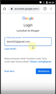 nah dikarnakan kita akan MEMBUAT BLOG, maka klik Tombol orange yang ada tulisan BUAT BLOG nya. setelah itu akan muncul halaman Login untuk melanjutkan ke BLOG