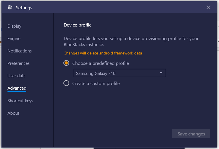 6. Dibagian Advanced kita akan memilih perangkat androidnya atau Profile Device nya, sebenarnya ada beberapa pilihan dan bisa di custom juga, namun kalau ane pilih yang samsung galaxy s10, karna pernah coba yang lain tapi agak lemot (entahlah apa ngaruhnya hhe)
