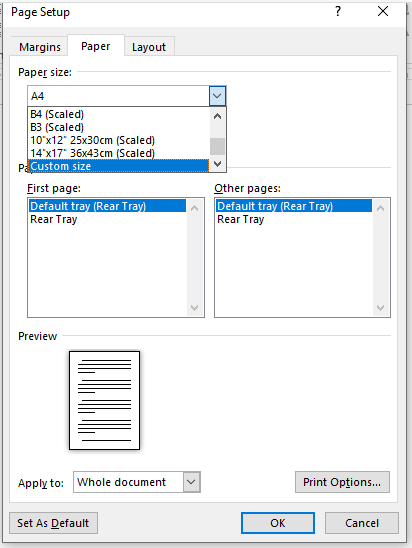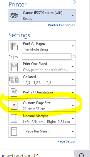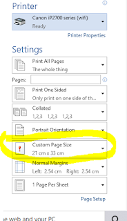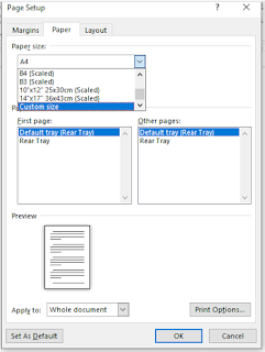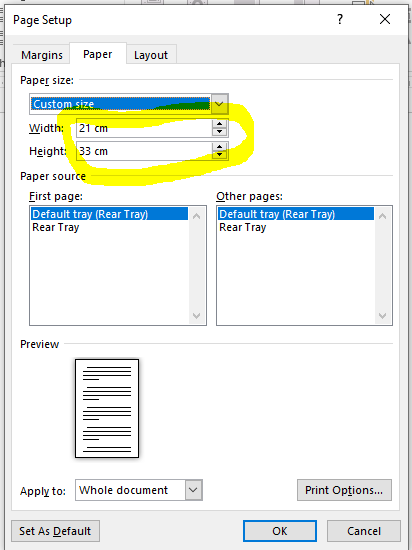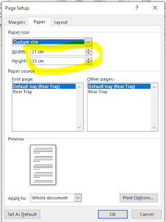 perhatikan gambar di atas, setelah muncul jendela PAGE SETUP pilih PAPER kemudian pada PAPER SIZE nya pilih CUSTOM SIZE dan isikan ukuran 21×33 cm seperti pada gambar di bawah ini