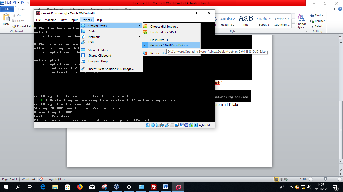 4. Untuk menginstall FTP Server kita menbutuhkan data dari cd bynery 2, maka masukan cd Debian bynery 2 dengan perintah “ apt-cdrom add” lalu cari file cdnya dan masukan cdnya  “devices – cd binery 2 “