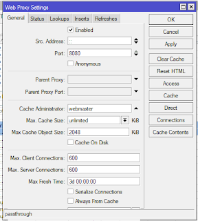 1. Buka aplikasi winbox, kemudian “ ip à web-proxy à enable “ centang kotak enable untuk mengaktipkan web-proxy nya.