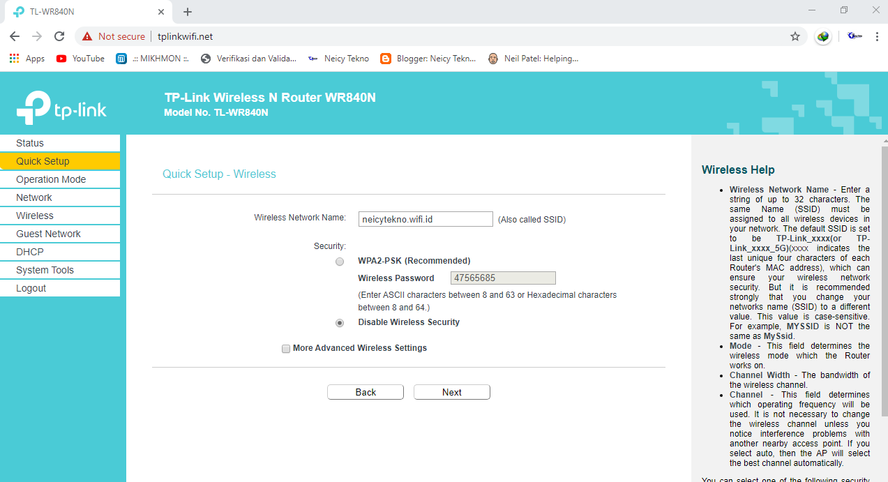 · Security = WPA-PSK ( digunakan untuk wifi biasa yang hanya memiliki 1 password, bukan untuk voucheran)