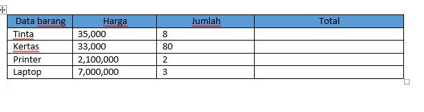Tabel di atas menyerupai nota pembayaran dimana ada Data/nama barang, Harga dan jumlah pembelian, saya menggunakan nota pembayaran sebagai contoh karna kita akan melakukan perhitungan otomatis seperti di Excel dan aplikasi pembayaran. Jadi seperi Aplikasi Nota menggunakan Word (bahasa kerennya) hhe karna kita akan melakukan perhitungan otomatis untuk jumlah dari barang yang di beli.