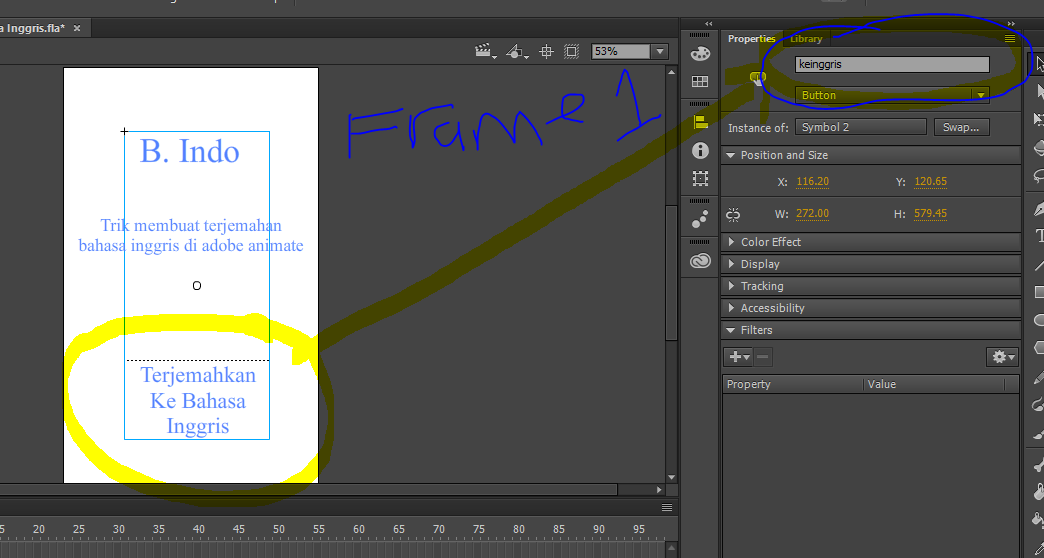 – Kemudian Buatkan Button dan instance name nya isi dengan nama “keindonesia”, kemudian arahkan ke frame 1