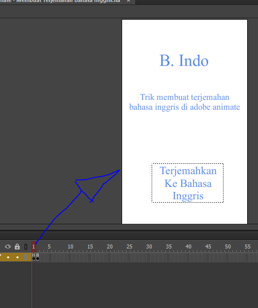 – Buatlah Kalimat sesuai kebutuhan kalian, Sebagai contoh saya menggunakan kalimat “B.Indo Trik membuat terjemahan bahasa inggris di adobe animate”