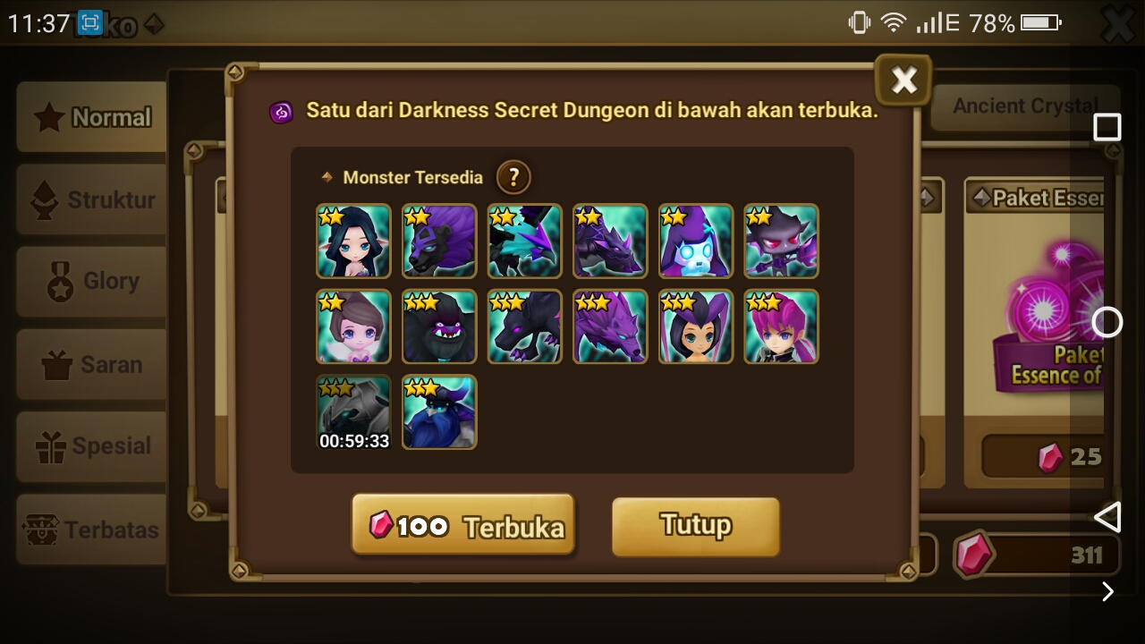 Nah kalau ini kita harus mengorbankan 100 crystal dan untuk monster yang bisa di buka secret dungeon-nya hanya monster yang tersedia pada SD nya, jadi kalian harus pikir-pikir dulu yah cari monster yang bener-bener di butuhkan dan sangat penting. Karna kalau menurut saya pribadi crystal sebanyak itu lebih baik di gunakan untuk kepentingan yang lain seperti membeli scroll premium.