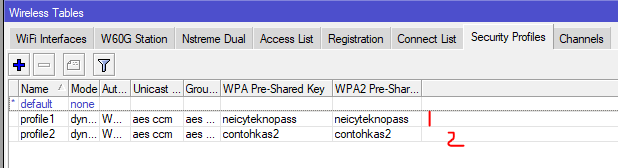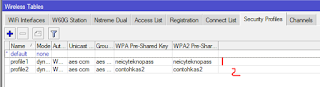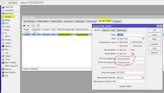 Security Profiles” akan tampak password wifi Mikrotik kita dengan jelas.