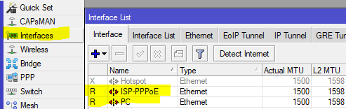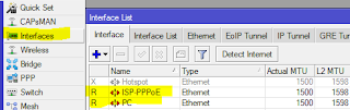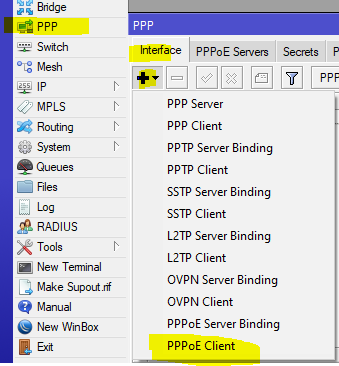 untuk mengoneksikan PPPoE Clientnya, kita masuk ke menu “ PPP > Interface”