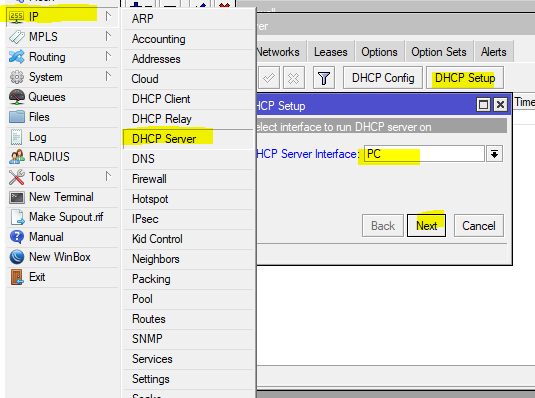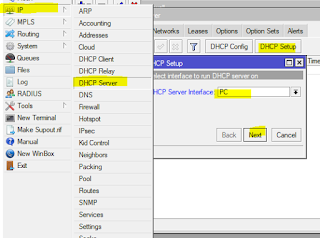 tambahkan DHCP server agar PC mendapatkan IP otomatis, masuk menu “ IP >