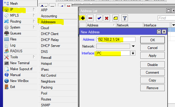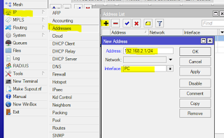 tambahkan Ip address untuk Interface PC. Masuk menu “ IP > Addresses >