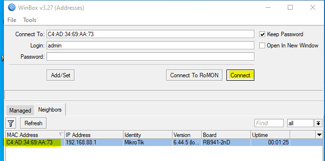 1. Masuk ke MikroTik dengan menggunakan Winbox, klik Mac Address Mikrotik