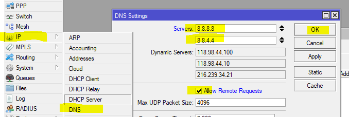 Caranya masuk menu “ IP > DNS “ isikan DNS Google yaitu 8.8.8.8 dan 8.8.4.4. dan jangan lupa centang “