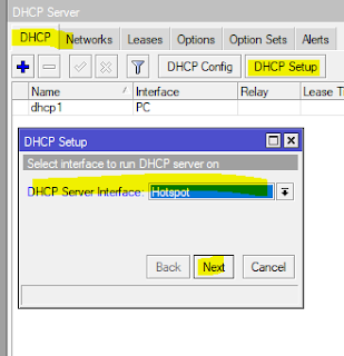 Sama seperti diatas masuk menu “ IP > DHCP Server > DHCP Setup “ arahkan DHCP Server Interfaces ke Hotspot kemudian klik “