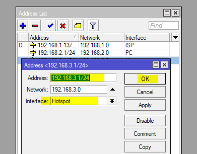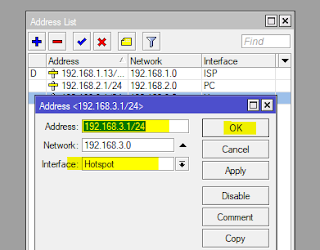 3. Hotspot : lakukan hal yang sama masuk ke menu “IP > Addresses > Add”
