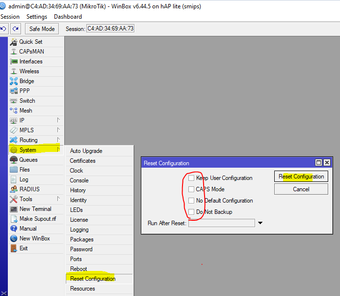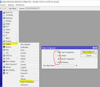 2. Masuk menu “ system > Reset Konfiguration “ hilangkan semua centang hingga seperti ini.