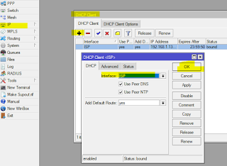 1. Interface ISP ,Masuk ke menu “ IP > DHCP-Client > add > Interface = ISP > OK “ pastikan Statusnya “ Bound “