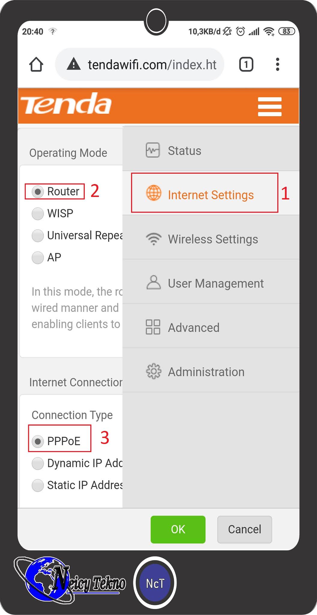 bahas cara setting di Tenda N301 mode PPPoE dengan menggunakan smartphone. Mode