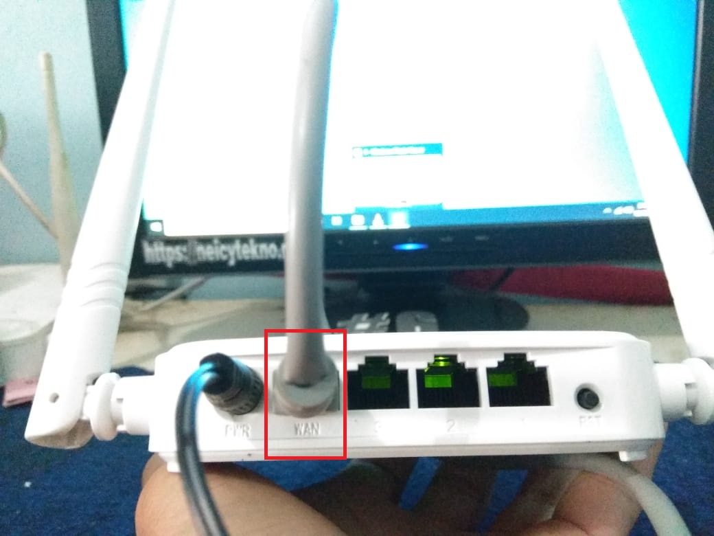 menyambungkan Kabel Lan dari ISP (internet) ke port Ethernet WAN pada routerTenda N301. Jika kalian salah memasukan kabel (masuk ether LAN) maka router