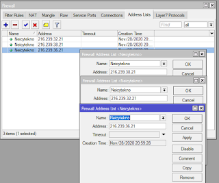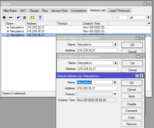 menu “IP—Firewall—Address List—Add” kemudian masukan setiap ip address situs yang