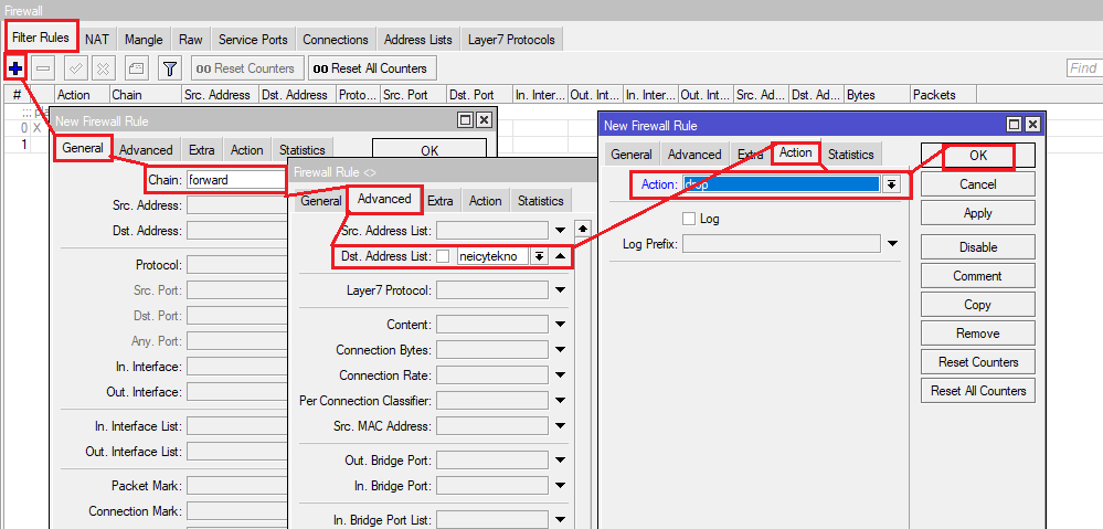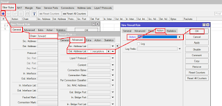 semua ip situs terkumpul, masuk menu “IP—Firewall—Filter Rulles—Add” dan buat