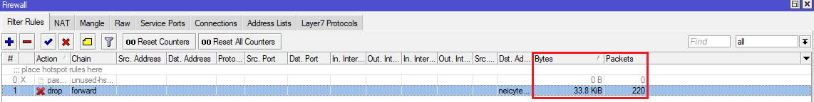 akan ada trafik melihat adanya trafik pada rule filter drop kita.