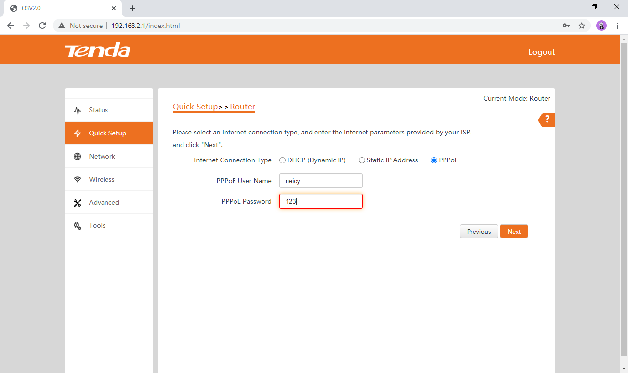 mode router PPPoE setiap client yang terhubung dengan Tenda 03 tidak perlu