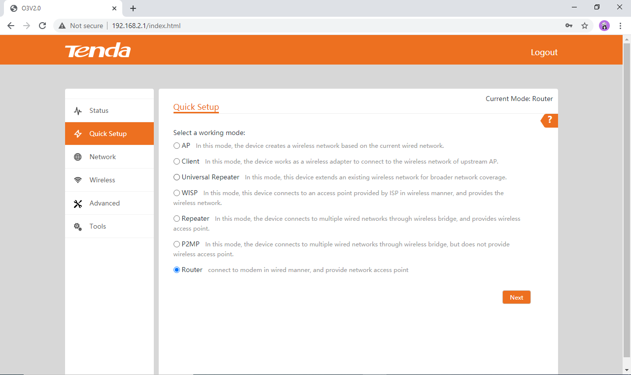Setup” agar lebih simple mengerjakannya dan pilih mode “Router”.