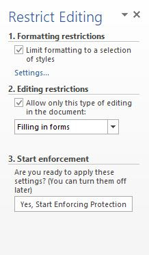 - Setelah itu lakukan pengamanan dengan cara, Pergi ke Tab Developer > Restrict Editing. kemudian gunakan pengaturan berikut agar peserta hanya bisa mengisi formulis saja :