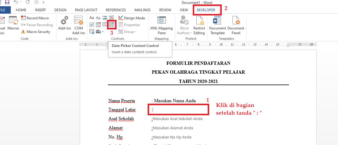- Di bagian Tanggal Lahir, Klik di bagian Setelah tanda ” : ” kemudian pergi ke Tab Developer > Date Picker Content Control