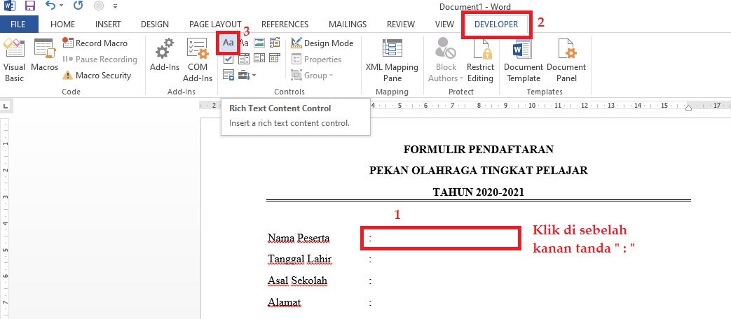 - Klik di bagian Setelah tanda ” : ” kemudian pergi ke Tab Developer > Rich Text Content Control