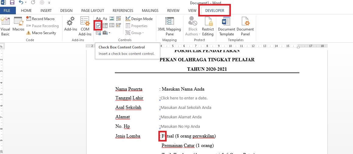 - Di bagian Jenis Lomba, Klik di bagian Sebelum Nama Lombanya kemudian Pergi ke Tab Developer > Check Box Content Control