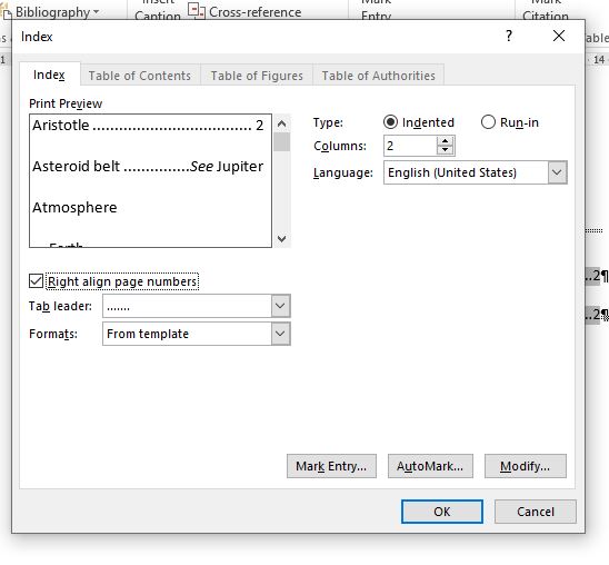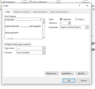 - Pergi ke TAB REFERENCES > Insert Index, Maka akan tampil Dialig Indeks nya
