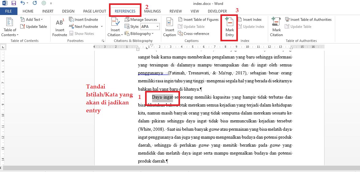 - Kemudian Pergi ke Tab REFERENCES > Mark Entry
