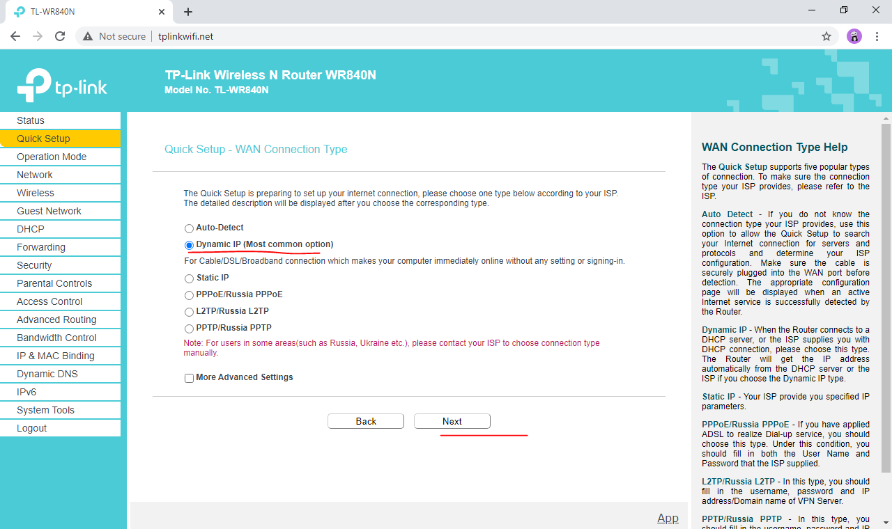 Setup” dan pilih “Dynamic IP” kemudian tekan “next”.