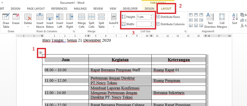 Seleksi Tabelnya kemudian pergi ke Tab Layout > Cell Size** Sebagai COntoh gunakan ukuran 1 cm,
