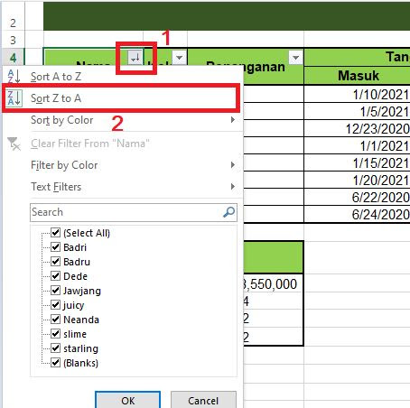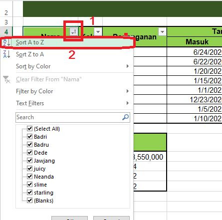 - Klik Tombol Drop Down nya, Kemudian Pilih Sort A to Z