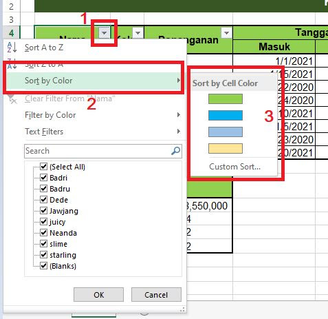 Cara 3 : Mengurutkan Data di Excel Sesuai Warna Cells