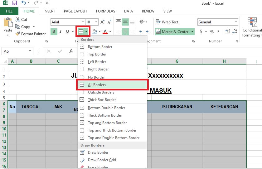 Seleksi bagian Tabelnya dan kemudian pergi ke Tab Home > Borders > All Borders