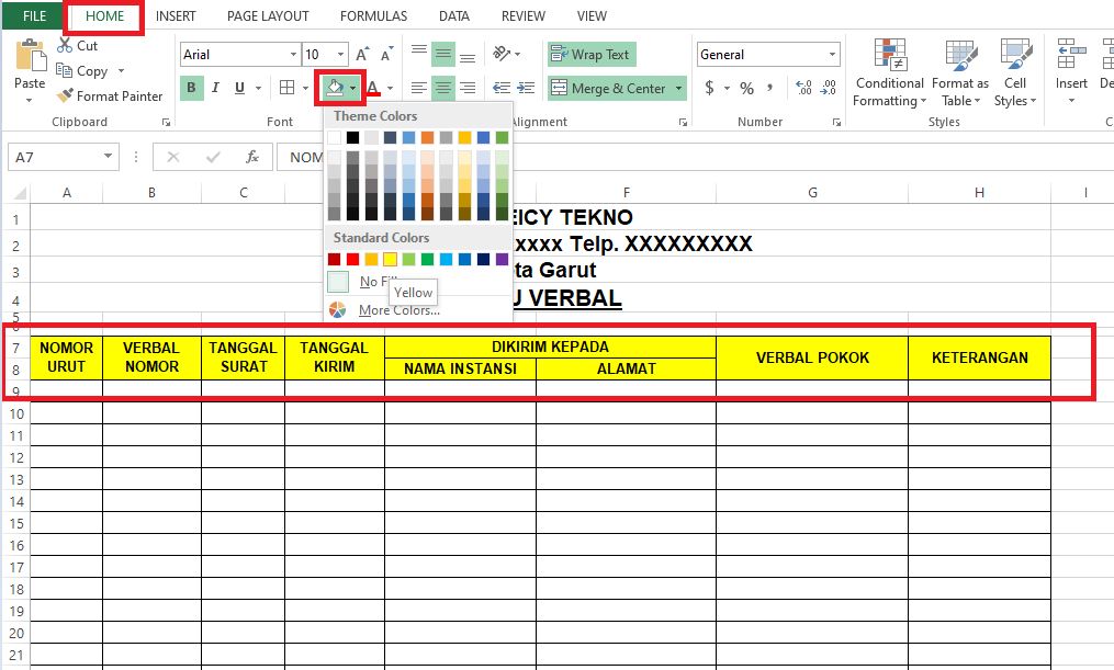 - Langkah terakhir adalah memberi warna pada Judul Kolomnya, Caranya dengan Seleksi Bagian Judul Kolomnya kemudian pergi ke Tab Home > Fill Color dan pilih Warna yang diinginkan.