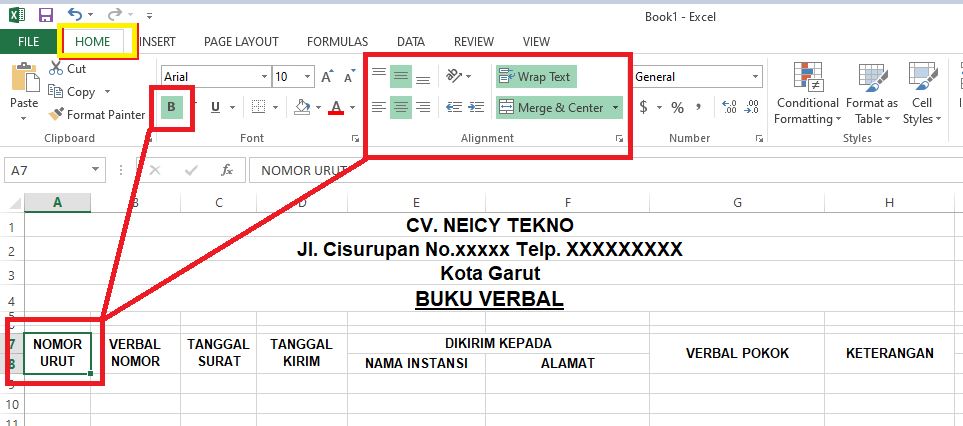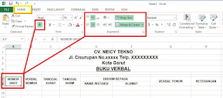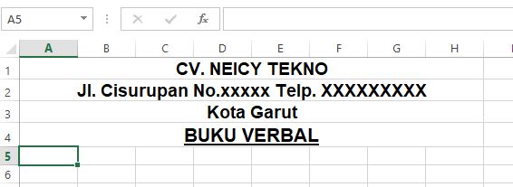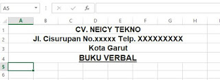 * Gunakan Jenis Font Arial / Times New Roman, Dengan diberikan Efek Tebal (Bold). Kemudian Untuk Nama perusahaan dan Alamat beri Ukuran Font 14pt. Untuk Jenis “BUKU VERBAL” nya beri 16pt atau 20pt dan Beri Efek tebal (Bold) serta Underline. - Kemudian Buatlah Judul pada Setiap Kolomnya. Perhatikan Gambar berikut :