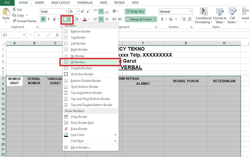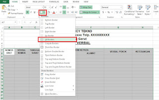 - Tambahkan Border (Tabel nya di pertebal), Caranya seleksi bagian Tabelnya kemudian pergi ke Tab Home > Borders > All Borders