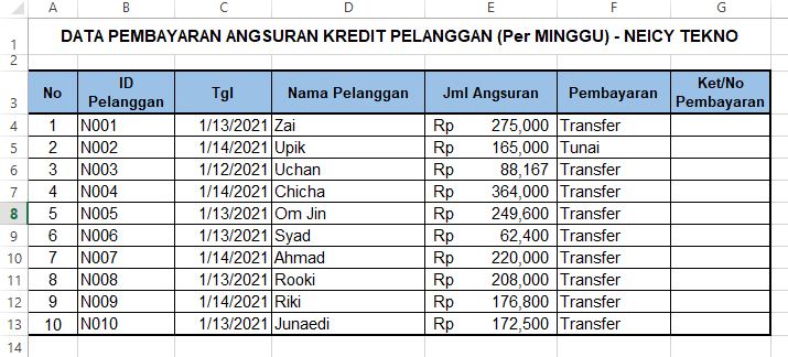 Isi dengan rumus pada Bagian Nama Pelanggan dan Jml Angsuran. Sedangkan sisanya di isi input sendiri.