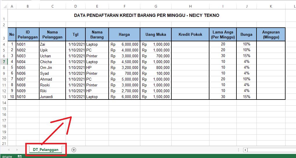 - Di Sheet 1, Ganti Nama Sheet Menjadi “DT_Pelangggan“