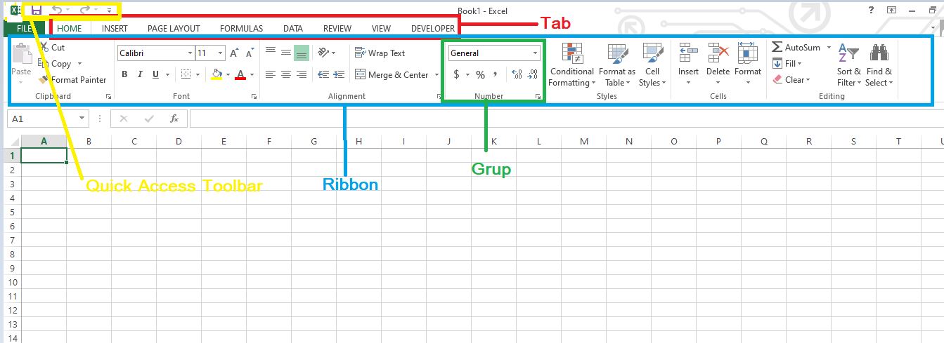 - Cells, Merupakan Potongan baris dan kolom. Cells memiliki nama yang terbentuk dari potongan kolom dan beris tersebut, Contohnya A1, A2, A3 dan lainnya.