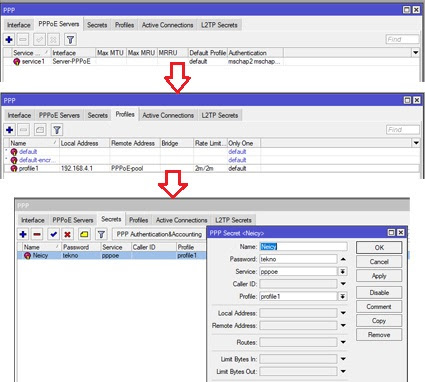 add name=Neicy password=tekno profile=profile1 service=pppoe