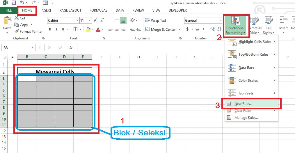 Mewarnai Sel di Excel bisa menggunakan Fitur Rule yang telah di sediakan di Ribbon Excel. Mewarnai Cells ini biasanya digunakan untuk memberikan Indikator warna dalam suatu kondisi tertentu dalam lembar kerja Excel.